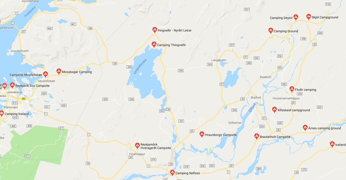 Starting out of Reykjavik, there is a stunning circular drive of 240 kilometers, lasting around four hours. The drive takes you through a stunning national park, and an area jam packed with hot springs at Geysir and Strokkur. Many campsites are also located along the Golden Circle.
