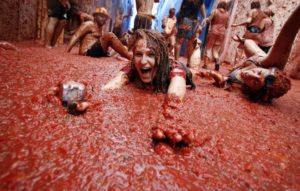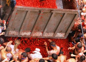 One of the biggest dates in the Spanish calendar, La Tomatina is a week long festival, which concludes with a massive Tomato fight.  La Tomatina takes place in a village called Buñol just outside Valencia on the last Wednesday of August.